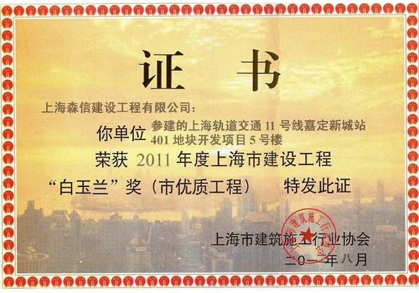 2012年8月嘉定新城401項(xiàng)目5#樓榮獲白玉蘭獎(jiǎng)